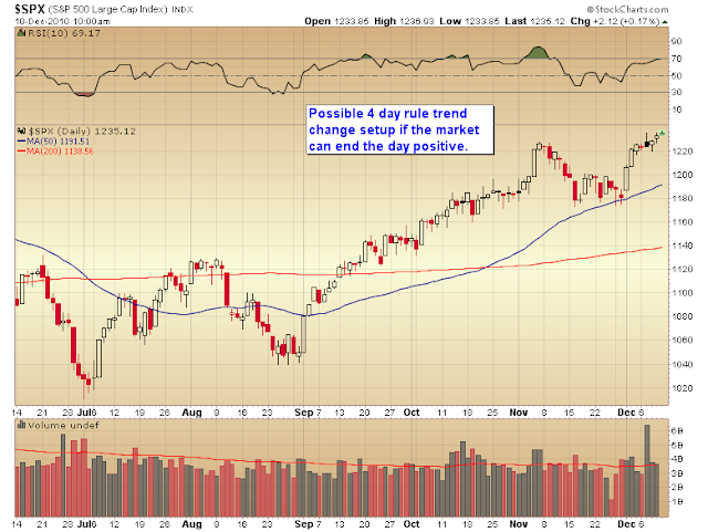 If the market can end the day with a gain we will get a 4 day rule possible trend change signal.The four day rule says: After a long intermediate rally look for the first down day to signal an intermediate trend change after the market rallies four or more days in a row.