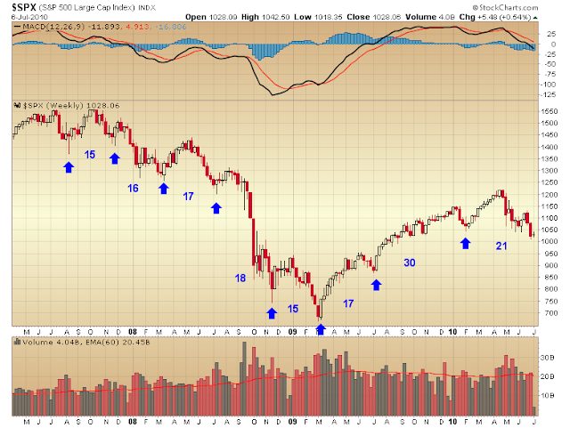 Here is what is happening. Roughly every 20-22 weeks the market dips into a major intermediate cycle low. The cycle tends to shorten a bit in bear markets simply because humans can’t remain negative as long as we can stay positive before our emotions become exhausted and need to take a break.