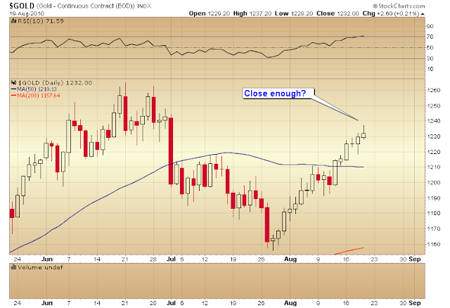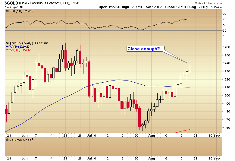 Gold is now due for a corrective move. Its rallied 15 out of the last 17 days and is now moving into the timing band for a cycle low. My best guess was that gold might make it to around $1240 before that corrective move began. Today was pretty close.