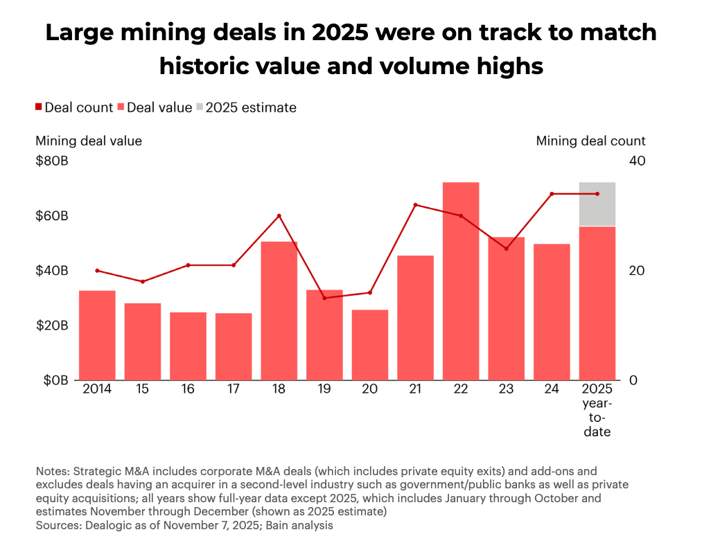 Bain estimates that global mining transactions valued above $500 million rose about 45% in 2025 compared with 2024, as companies looked to secure scale and resilience through acquisitions rather than greenfield development.