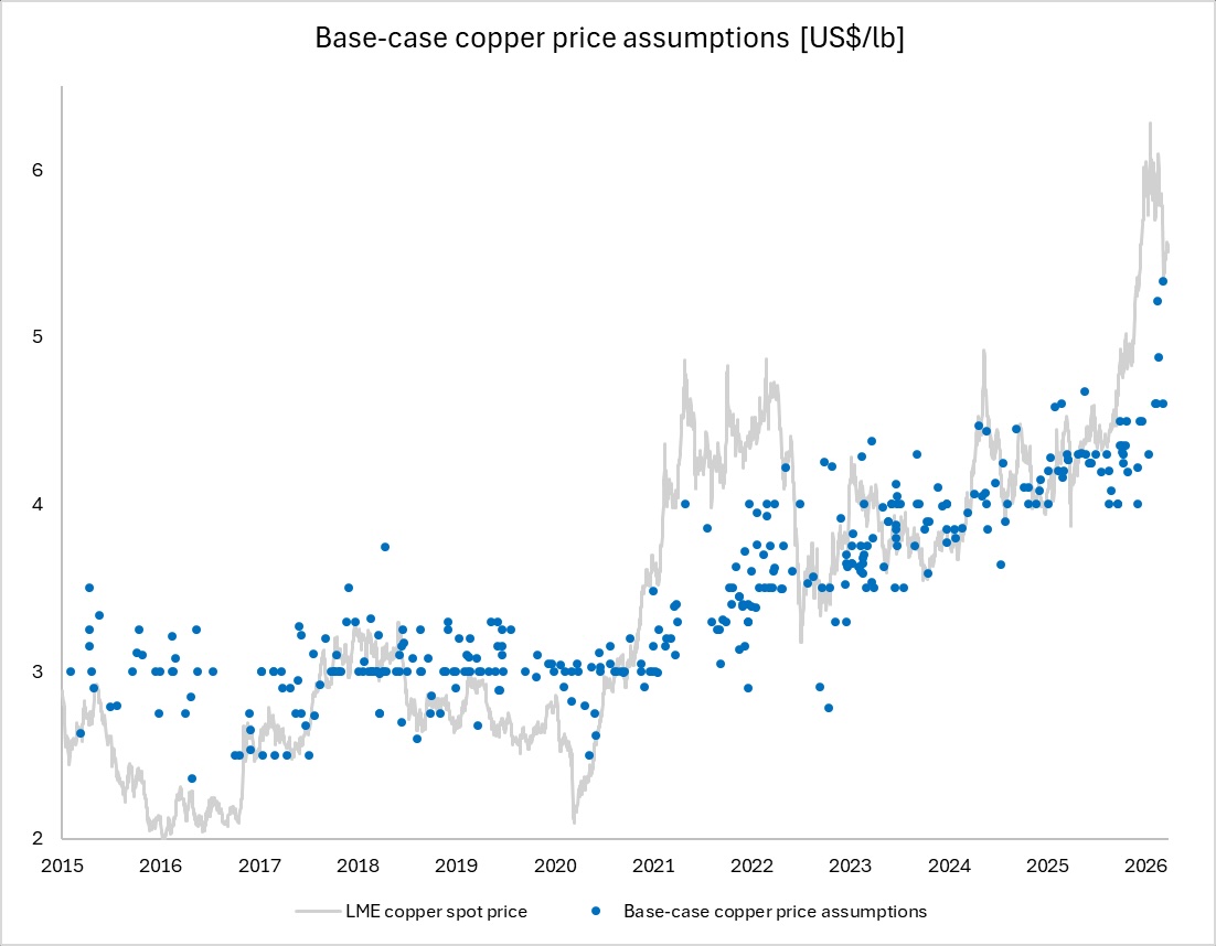 Copper price assumptions in mining studies that guide investment decisions have surged roughly 60% since 2020, signalling a structurally stronger outlook for the metal.