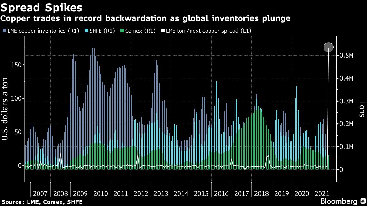 Copper trades in record backwardation as global inventories plunge Bruno Venditti | October 15, 2021 | 7:48 am Share Comments Cancel replyYour email address will not be published. Required fields are marked * Save my name, email, and website in this browser for the next time I comment. Δ No comments found. More News BHP’s Vicuna unveils $18 billion copper investment in Argentina The project is forecast to average 395,000 tons of copper, 711,000 ounces of gold, and 22.2 million ounces of silver annually over its first 25 years. February 16, 2026 | 01:26 pm {{ commodity.name }} {{ post.title }} {{ post.excerpt }} {{ post.date }} First < {{ page }} > Last