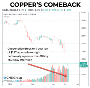 comex-copper-mar-19-2020-rally- Frik Els | March 19, 2020 | 12:18 pm Share Comments Cancel replyYour email address will not be published. Required fields are marked * Save my name, email, and website in this browser for the next time I comment. Δ No comments found. More News BHP’s Vicuna unveils $18 billion copper investment in Argentina The project is forecast to average 395,000 tons of copper, 711,000 ounces of gold, and 22.2 million ounces of silver annually over its first 25 years. February 16, 2026 | 01:26 pm {{ commodity.name }} {{ post.title }} {{ post.excerpt }} {{ post.date }} First < {{ page }} > Last