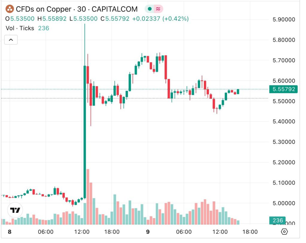 In New York, the most-traded copper futures soared to a record $5.9535/lb. following Trump’s announcement, for an intraday gain of nearly 17%.