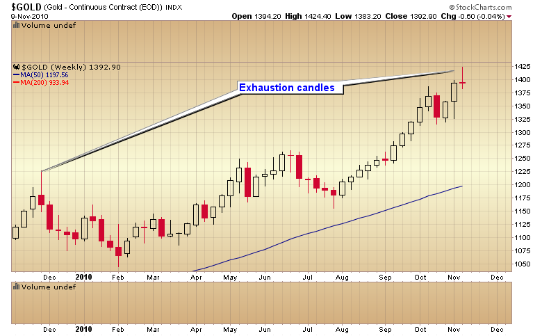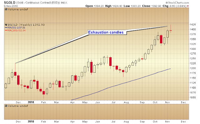 The gold cycle is a bit shorter at 15 weeks but still in the timing band for a top. If we end they week about where we are today then gold will form a perfect exhaustion candle on the weekly charts.