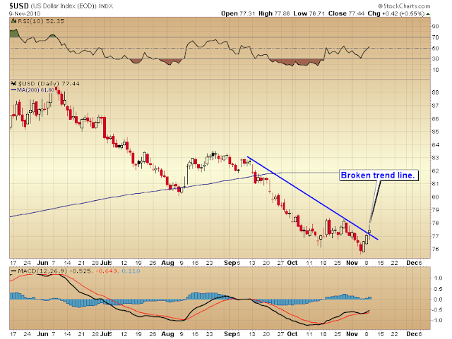 Since June the dollar has been collapsing down into a yearly cycle low. I didn’t expect that low until the dollar reached at least 74 and I thought it even more likely we would see 71 before the cycle bottomed. However yesterday the dollar through us a major curve ball. What should have been a minor bear flag that would resolve with a downward break has gotten unexpected traction.Yesterday the dollar broke the down trend line and it now appears clear that the dollar has formed a shortened daily cycle low.