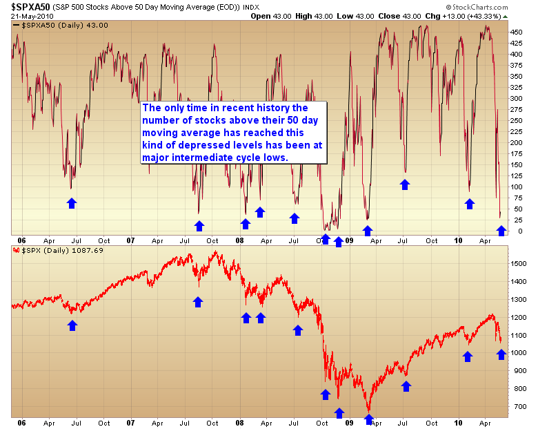 You can see from the following chart the number of stocks trading above the 50 day moving average has reached such depressed levels that even in the last bear market these kind of skewed levels have led to sharp rallies.