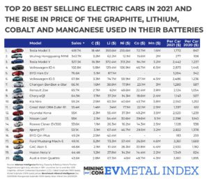 Top-20-electric-cars-of-2021-lithium-cobalt-nickel-manganese-graphite-price Frik Els | January 13, 2022 | 3:44 pm Share Comments Cancel replyYour email address will not be published. Required fields are marked * Save my name, email, and website in this browser for the next time I comment. Δ No comments found. More News CHART: EV battery metals index jumps to 27-month high EV battery raw materials bill tops $2 billion for the first time since August 2023 and surging lithium, nickel prices going into 2026 puts slump definitively in the rearview mirror. February 16, 2026 | 11:28 am {{ commodity.name }} {{ post.title }} {{ post.excerpt }} {{ post.date }} First < {{ page }} > Last