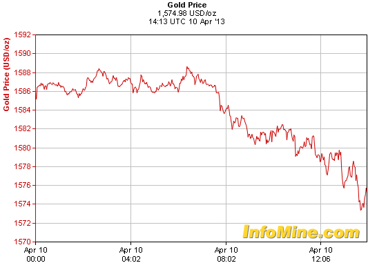 gold-price-down-april-10 Cecilia Jamasmie | April 10, 2013 | 2:17 pm Share Comments Cancel replyYour email address will not be published. Required fields are marked * Save my name, email, and website in this browser for the next time I comment. Δ No comments found. More News Iran says potential energy, mining deals on table in talks with US Iran has threatened to strike US bases in the Middle East if it is attacked by US forces but on Sunday took a conciliatory line. February 15, 2026 | 09:34 am {{ commodity.name }} {{ post.title }} {{ post.excerpt }} {{ post.date }} First < {{ page }} > Last