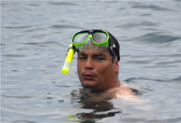 Image of President Rafael Vicente Correa Delgado snorkeling near the Galápagos islands in June 2008 from the Presidency’s Flickr feed.