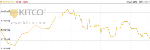 five month low gold MINING.COM Staff Writer | November 20, 2013 | 5:26 pm Share Kitco." class="fb-share"> Comments Cancel replyYour email address will not be published. Required fields are marked * Save my name, email, and website in this browser for the next time I comment. Δ No comments found. More News Trump trade team working to narrow scope of metals tariffs Trump last year imposed a 50% levy on foreign steel and aluminum in a measure aimed at Chinese overcapacity. February 13, 2026 | 12:14 pm {{ commodity.name }} {{ post.title }} {{ post.excerpt }} {{ post.date }} First < {{ page }} > Last
