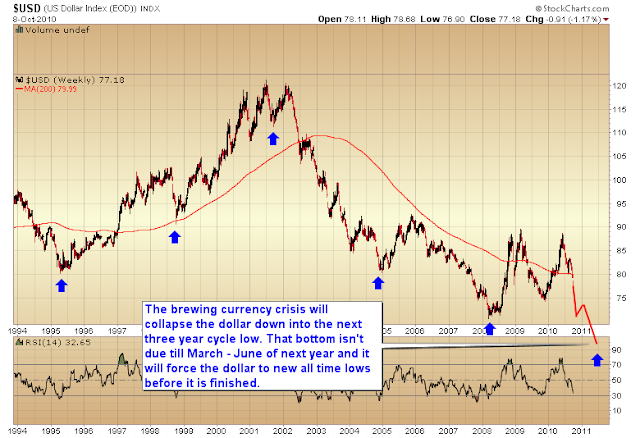 But don’t forget the larger three year cycle low isn’t due to hit until next spring/summer. The dollar rally out of the yearly cycle low in December will also be a dead cat bounce, although it should last at least a month or two, but ultimately it too will fail and the true consequences of Bernanke’s monetary policies will come home to roost as the dollar crashes down into the three year cycle bottom and the currency crisis reaches a climax next year.