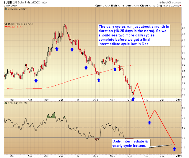 As I noted in the above chart the intermediate dollar, and gold cycle for that matter, runs on average 20 weeks. Last week marked the 9th week of the dollars intermediate cycle. It’s way too early to look for a major bottom yet. If the cycle runs the “normal” 20 weeks then we won’t get an intermediate bottom until late December. Considering the last yearly cycle low came in early December of `09 mid December should be a fairly accurate target for an intermediate bottom.