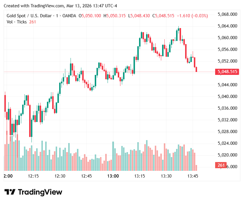 Bullion has traded sideways in recent sessions as the war in the Middle East continues with no end in sight. An initial spike earlier this month after the US-Israeli strike on Iran was succeeded by a bigger drop, and the metal has since traded mostly within a tight range between $5,000 and $5,200 an ounce.