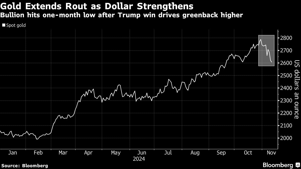Gold Extends Rout as Dollar Strengthens | Bullion hits one-month low after Trump win drives greenback higher Jackson Chen | November 12, 2024 | 9:46 am Share Comments Cancel replyYour email address will not be published. Required fields are marked * Save my name, email, and website in this browser for the next time I comment. Δ No comments found. More News BHP’s Vicuna unveils $18 billion copper investment in Argentina The project is forecast to average 395,000 tons of copper, 711,000 ounces of gold, and 22.2 million ounces of silver annually over its first 25 years. February 16, 2026 | 01:26 pm {{ commodity.name }} {{ post.title }} {{ post.excerpt }} {{ post.date }} First < {{ page }} > Last