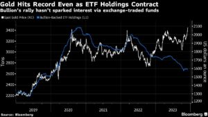 Gold Hits Record Even as ETF Holdings Contract | Bullion’s rally hasn’t sparked interest via exchange-traded funds Jackson Chen | December 4, 2023 | 9:37 am Share Comments Cancel replyYour email address will not be published. Required fields are marked * Save my name, email, and website in this browser for the next time I comment. Δ No comments found. More News Gold price hovers near $5,000 with US and China closed “The market remains in a phase of rebalancing between bulls and bears, lacking clear catalysts to break the range,” analyst says. February 16, 2026 | 09:43 am {{ commodity.name }} {{ post.title }} {{ post.excerpt }} {{ post.date }} First < {{ page }} > Last
