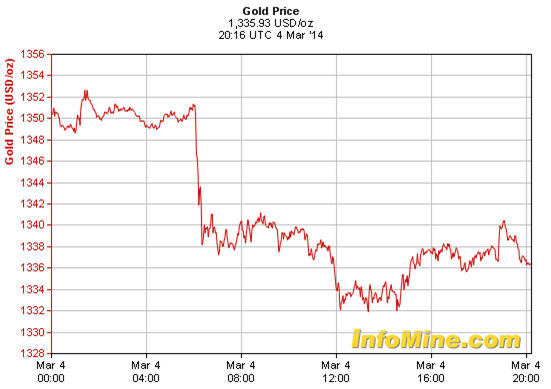 Gold price March 4, 2014 MINING.COM Staff Writer | March 4, 2014 | 8:21 pm Share Comments Cancel replyYour email address will not be published. Required fields are marked * Save my name, email, and website in this browser for the next time I comment. Δ No comments found. More News Gold trades at discounts in India for first time in nearly a month Indian bullion dealers this week offered a discount of up to $12 per ounce over official domestic gold prices. February 14, 2026 | 10:00 am {{ commodity.name }} {{ post.title }} {{ post.excerpt }} {{ post.date }} First < {{ page }} > Last