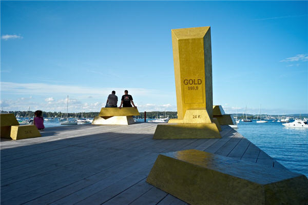 Image of seaside benches in the shape of gold bars in Kreuzlingen, canton of Thurgau, by Sascha Erni