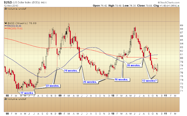 Far more likely in my opinion that the dollar rally will fail at 80 and roll over into the natural timing band for an intermediate cycle low sometime in mid to late December. This should drive stocks and gold higher into December before finally rolling over into intermediate degree corrections in January or early February.
