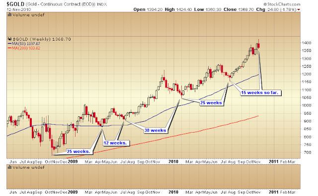 Every single one of them has run long except one and that one was followed by a very stretched 30 week cycle. If the current cycle follows the pattern of the last two years then it’s too early to expect an intermediate top, and the current correction is nothing more than the normal move down into a daily cycle low. Once that bottom is in place (possibly sometime next week) it should be followed by one more daily cycle higher before putting in the larger degree intermediate top.