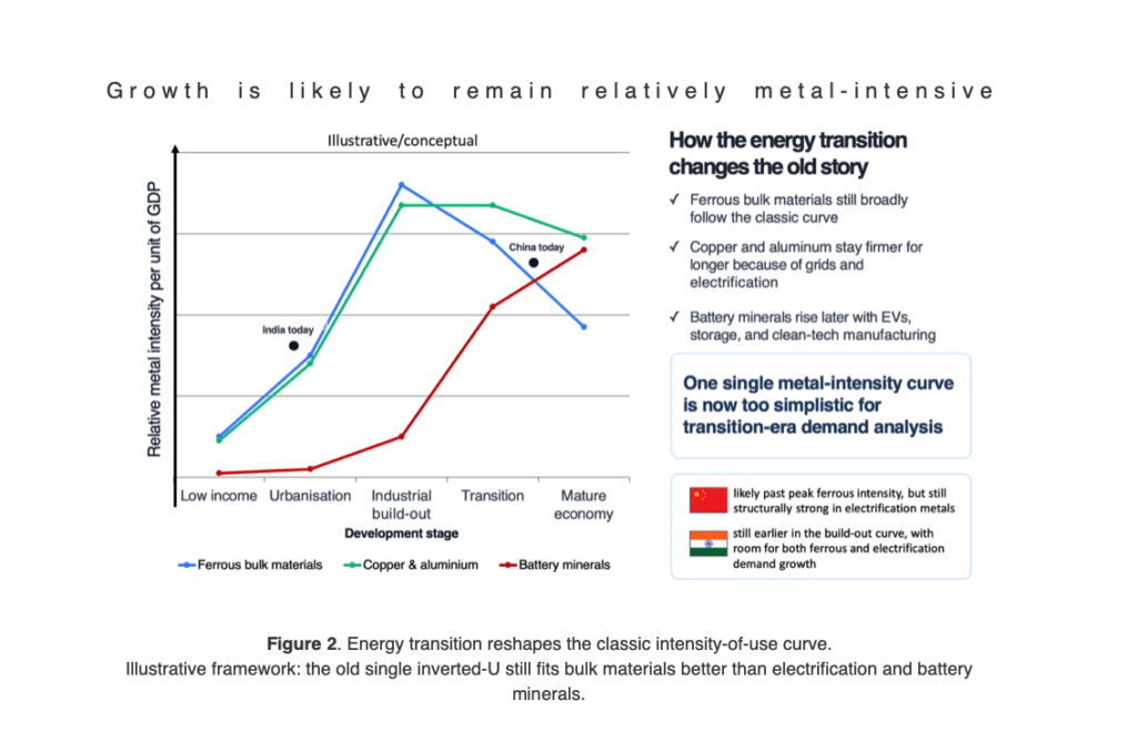 India appears to be entering the more metal-intensive phase of that curve. Lower income levels, limited infrastructure and ongoing urbanization suggest sustained demand growth across a range of commodities. However, its development path is likely to be more diversified and electricity-driven than China’s earlier property-led expansion.