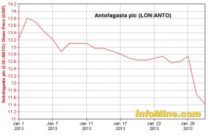 antofagasta-stock-feb-1-2013 Cecilia Jamasmie | February 1, 2013 | 3:12 pm Share Comments Cancel replyYour email address will not be published. Required fields are marked * Save my name, email, and website in this browser for the next time I comment. Δ No comments found. More News Copper price: Global exchange stocks top 1 million tonnes first time in 21 years Copper stocks on the world's biggest metal exchanges have exceeded 1 million tons for the first time since 2004. February 16, 2026 | 12:35 pm {{ commodity.name }} {{ post.title }} {{ post.excerpt }} {{ post.date }} First < {{ page }} > Last