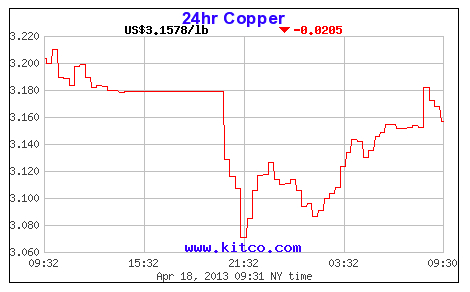 Copper hit lowest in 18 months Cecilia Jamasmie | April 18, 2013 | 1:33 pm Share Comments Cancel replyYour email address will not be published. Required fields are marked * Save my name, email, and website in this browser for the next time I comment. Δ No comments found. More News Mexico and Canada plan joint action on minerals The countries will present an joint action plan on minerals, infrastructure and supply chains in the second half of the year. February 16, 2026 | 09:46 am {{ commodity.name }} {{ post.title }} {{ post.excerpt }} {{ post.date }} First < {{ page }} > Last