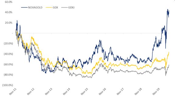 The results are there for all to see. Simply take a look at how NOVAGOLD has performed relative to the GDXJ and GDX indexes since Greg and I took the helm in late 2011 in Figure 3. This isn’t cherry picking.