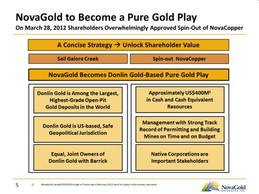 - In order to make NOVAGOLD the only “pure play” on Donlin Gold in the marketplace, we promised to sell Galore Creek – a beautiful asset, but “a project too far” for a development-stage Company with a flagship as ambitious as Donlin Gold. We could have let Galore go in a fire sale. We didn’t. We sold it for real money in a market where win-win monetization has been the exception, not the rule. The cash position we find ourselves in, with more guaranteed and potential payments to come, is the envy of our space;