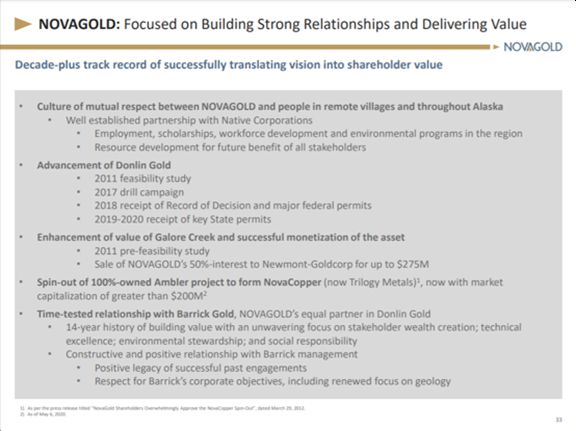 It is axiomatic that the present management cannot be held responsible, directly or tangentially, for actions that took place prior to their assuming leadership of the Company and which they then effectively fixed. The present management team has been leading NOVAGOLD for eight years – not 15 – during which time it has not misled investors in any fashion. To the contrary, their tenure coincides with an era of complete transparency in their corporate communications, as well as uninterrupted management successes in working with their partner Barrick Gold to take the Donlin Gold project up the value chain and in addition to unlocking for shareholders the considerable value of the copper assets they inherited.