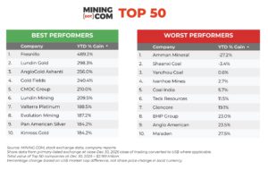 TOP 50 Q4 2025 BEST WORST PERFORMERS Frik Els | December 31, 2025 | 2:12 pm Share Comments Cancel replyYour email address will not be published. Required fields are marked * Save my name, email, and website in this browser for the next time I comment. Δ No comments found. More News Mexico and Canada plan joint action on minerals The countries will present an joint action plan on minerals, infrastructure and supply chains in the second half of the year. February 16, 2026 | 09:46 am {{ commodity.name }} {{ post.title }} {{ post.excerpt }} {{ post.date }} First < {{ page }} > Last