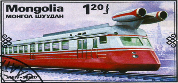 Stamp circa 1979 shows the Soviet Rapidity experimental train from the series “Locomotives.” Image by AlexanderZam / Shutterstock.com