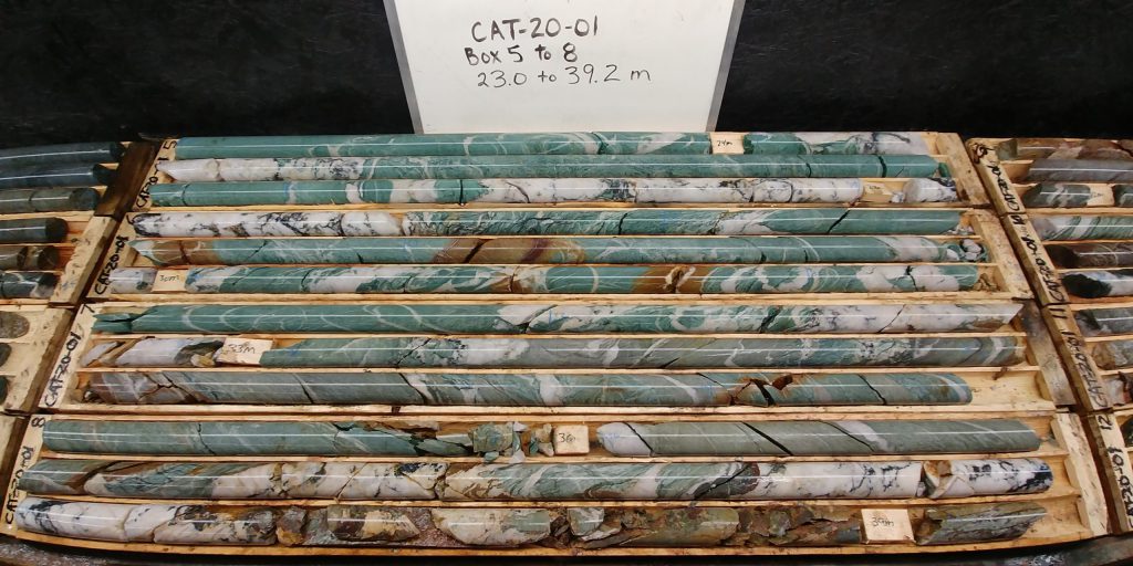 Drillhole CA 20-01 hit 33.1 metres of 2.81 g/t gold starting at 31.9 metres. This interval includes higher-grade sections, such as 4 metres of 14.89 g/t gold from 50 metres.