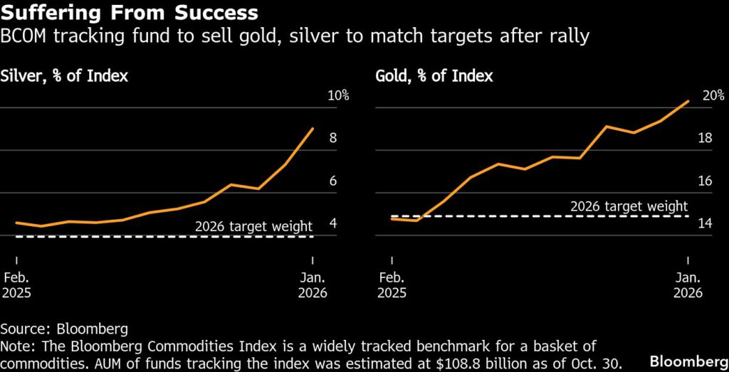 Both metals faced a similar index selloff last year, without causing a discernible drag on the market, according to a December note from JPMorgan Chase. The bank, however, said the amount of selling required in silver is more outsized this year.