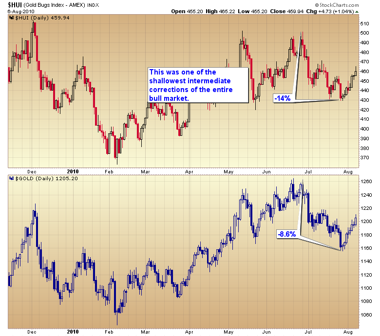 Even more amazing was the correction by mining stocks. I know a great many investors and traders became disgusted with miners and probably gave up on them during the last 6 weeks. But the reality is the 14% correction in miners is again one of the mildest intermediate pullbacks of the entire bull market.