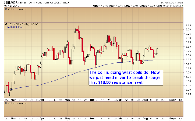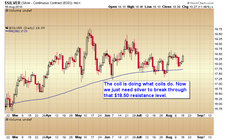 Last week I called attention to the volatility coils forming in the S&P and silver. About 70% of the time the initial thrust out of a coil ends up being a false move that is quickly reversed by a more powerful and durable move in the opposite direction.