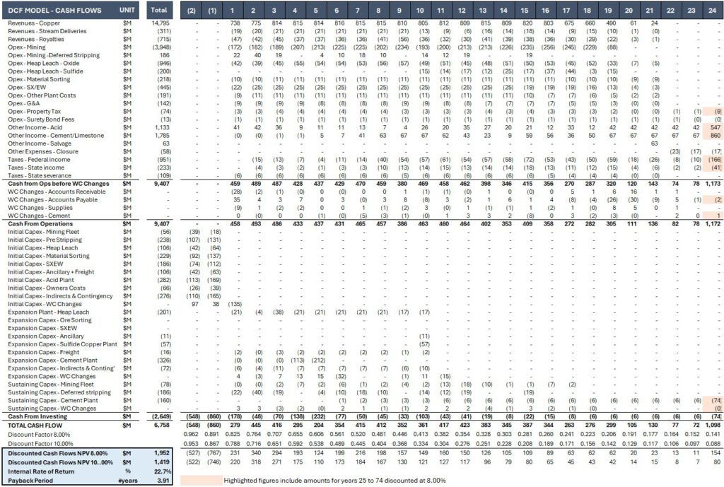 The PEA base case generates an after-tax Net Present Value of approximately $2.0 billion (at a discount rate of 8%) and an Internal Rate of Return (IRR) of 22.7%. This financial analysis is based on a non-levered cash flow model, revenues and costs priced in 2026 real US dollars, mid period discounting, and a valuation date set at the start of Project construction. The following tables detail key financial model inputs.