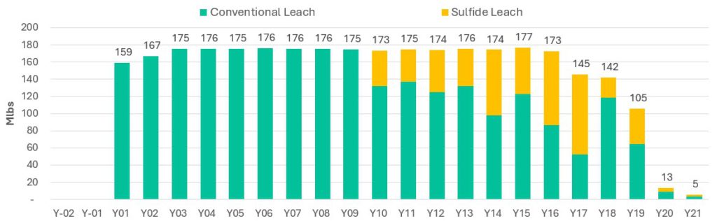 - Average annual copper cathode production of 174 million pounds (“lbs”) (87 thousand tons) for the first 15 years; enough to potentially supply over 11% of the current United States domestic refined copper metal production from mineralized material1. Total copper produced 3.2 billion lbs over a 21 year mine life.