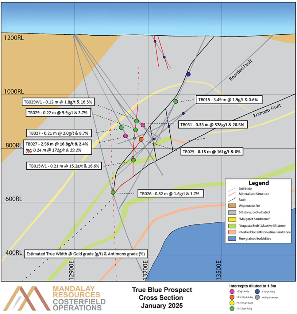 “These results represent a significant breakthrough, intercepting high-grade mineralization with visible gold and stibnite (antimony mineral) veins. Mineralization extends 130 metres along strike with strong potential for expansion. The surface expression of the system lies 300 metres above these high-grade intercepts, highlighting its significant vertical extent. Encouragingly, drilling also confirmed down-dip mineralization at 590 metres depth with further potential. Step-out drilling of 600 metres to the south uncovered a wide anomalous mineralized zone of approximately 250 metres, with assays up to 3.8 g/t gold, highlighting the system’s continuity and scale. “Mandalay is committed to unlocking the full potential of True Blue through an extensive extensional drilling program. Two rigs will commence follow-up drilling in the coming weeks, with results expected in the months ahead. Additional drill metres and drill rig intensity will be determined by staged assessments, as we work toward building a robust Mineral Resource to potentially extend Costerfield’s mine life.”