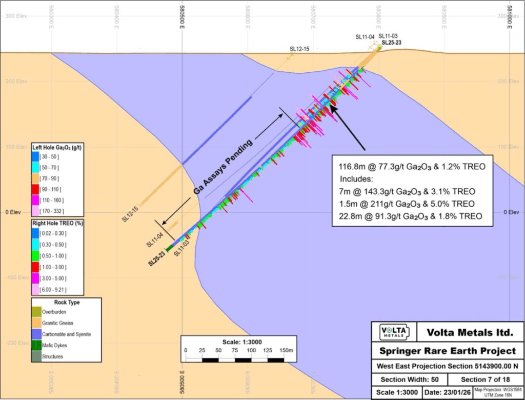 Volta Metals Ltd. (CSE: VLTA) (FSE: D0W) (OTC Pink: VOLMF) (“Volta” or the “Company”) is pleased to report initial gallium assay results from its Springer Rare Earth Project near Sudbury, Ontario, Canada. The newly received assays from drill hole SL25-23 confirm thick, continuous gallium mineralization over a 116.8m interval grading 77 g/t Ga2O3, including multiple high-grade zones exceeding 100 g/t Ga2O3 (Figure 1).