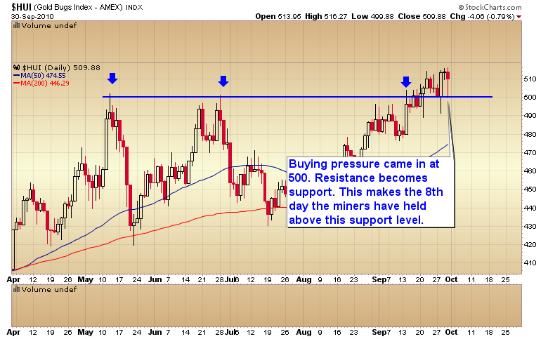 Gold is likely now in a runaway move higher. Smart money is using any and all pullbacks to get in ahead of the inflationary storm that’s coming. We saw it in the action yesterday. Gold briefly traded down to the $1300 level and miners briefly tagged 500. Buying pressure immediately came in at those levels.