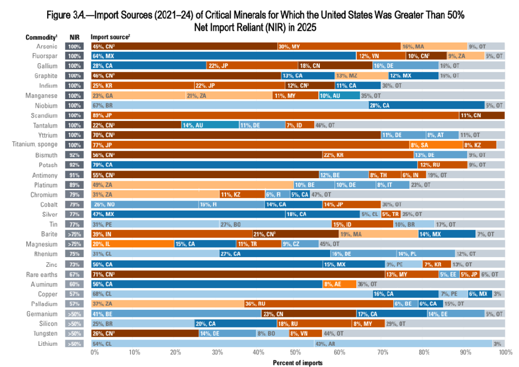 For many of the USGS critical minerals, China features prominently as a key supply source, accounting for nearly half of its arsenic and graphite imports, 55% of its antimony, and 70% of rare earths.