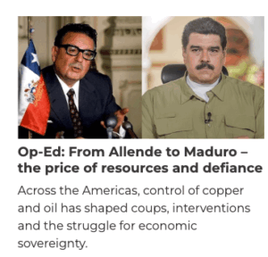 op-ed-allende-to-maduro Cecilia Jamasmie | January 7, 2026 | 7:04 am Share Comments Cancel replyYour email address will not be published. Required fields are marked * Save my name, email, and website in this browser for the next time I comment. Δ No comments found. More News Copper price: Global exchange stocks top 1 million tonnes first time in 21 years Copper stocks on the world's biggest metal exchanges have exceeded 1 million tons for the first time since 2004. February 16, 2026 | 12:35 pm {{ commodity.name }} {{ post.title }} {{ post.excerpt }} {{ post.date }} First < {{ page }} > Last