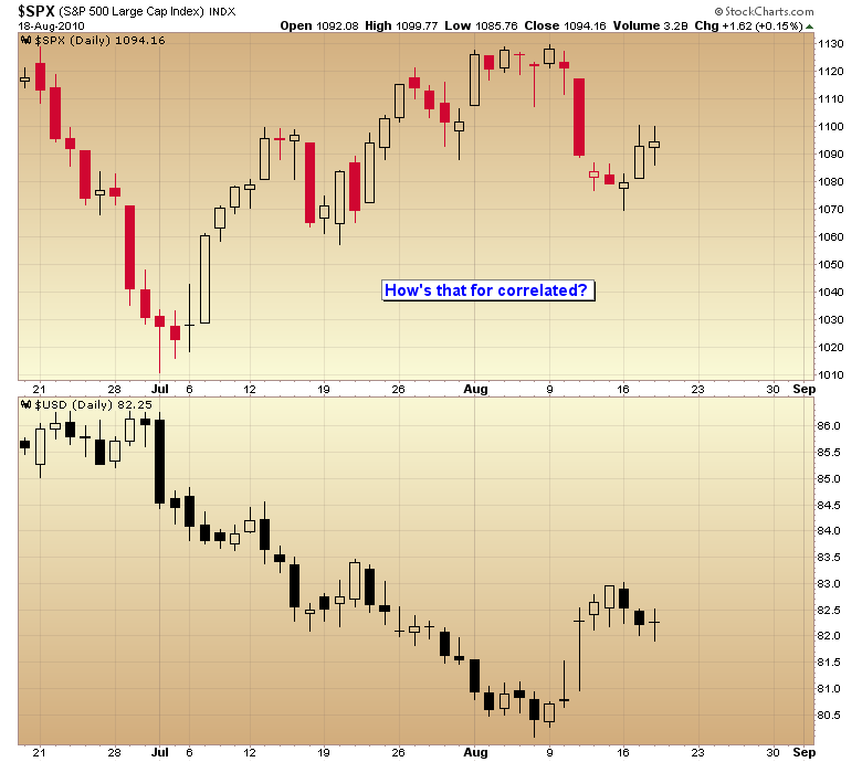 Another requirement for rising stocks, in my opinion, is a falling dollar. Bernanke probably realizes by now he isn’t going to be able to print prosperity (I’ve said all along that simply printing money won’t heal the economy or create jobs). However I don’t expect that to deter him from further debasement of the dollar. He knows that asset inflation is the next best thing, and I have no doubt he will do everything in his power to keep asset markets inflated.
