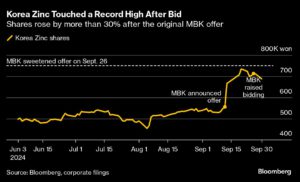 Korea Zinc Touched a Record High After Bid | Shares rose by more than 30% after the original MBK offer Amanda Stutt | October 1, 2024 | 5:15 pm Share Comments Cancel replyYour email address will not be published. Required fields are marked * Save my name, email, and website in this browser for the next time I comment. Δ No comments found. More News BHP’s Vicuna unveils $18 billion copper investment in Argentina The project is forecast to average 395,000 tons of copper, 711,000 ounces of gold, and 22.2 million ounces of silver annually over its first 25 years. February 16, 2026 | 01:26 pm {{ commodity.name }} {{ post.title }} {{ post.excerpt }} {{ post.date }} First < {{ page }} > Last