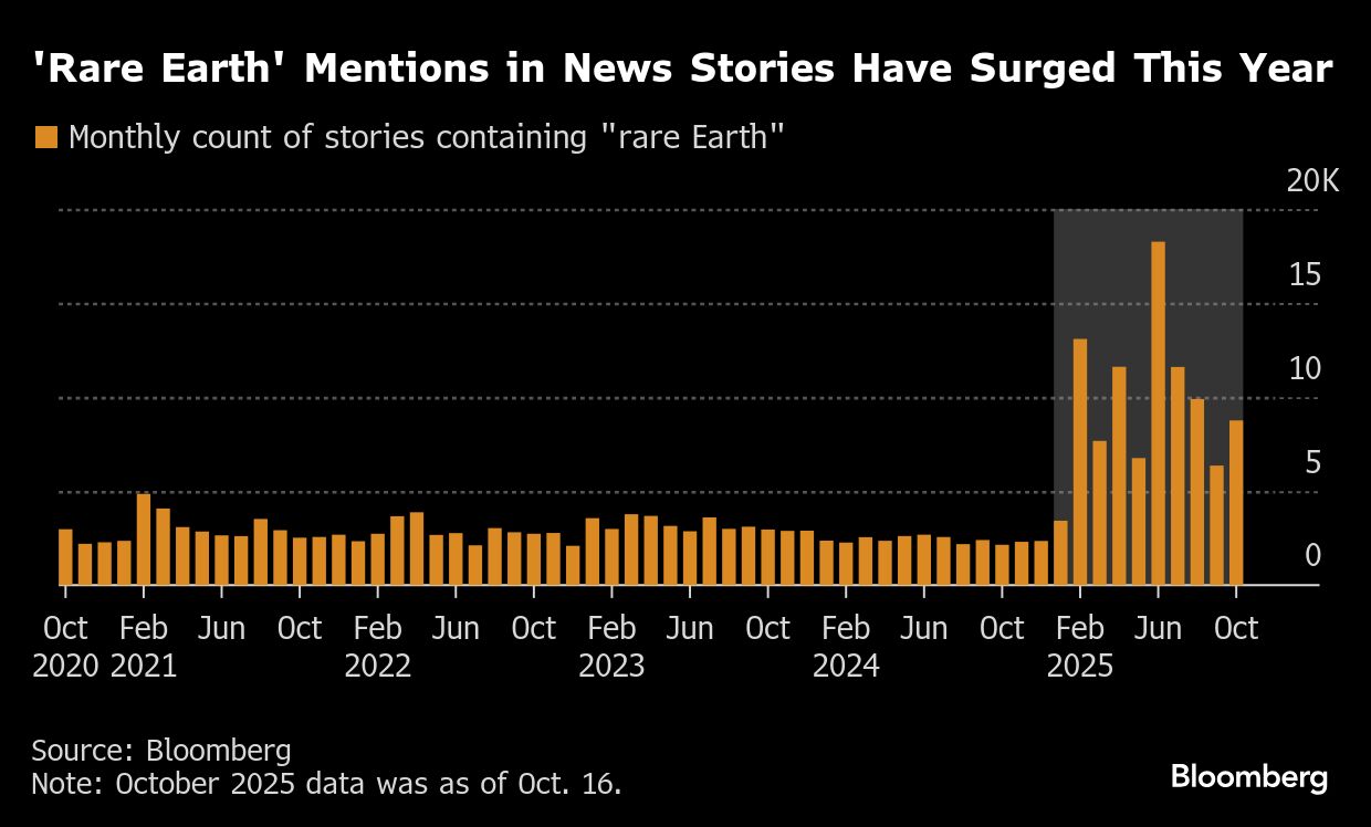 ‘Rare Earth’ Mentions in News Stories Have Surged This Year Jackson Chen | October 19, 2025 | 9:38 am Share Comments Cancel replyYour email address will not be published. Required fields are marked * Save my name, email, and website in this browser for the next time I comment. Δ No comments found. More News Copper price: Global exchange stocks top 1 million tonnes first time in 21 years Copper stocks on the world's biggest metal exchanges have exceeded 1 million tons for the first time since 2004. February 16, 2026 | 12:35 pm {{ commodity.name }} {{ post.title }} {{ post.excerpt }} {{ post.date }} First < {{ page }} > Last