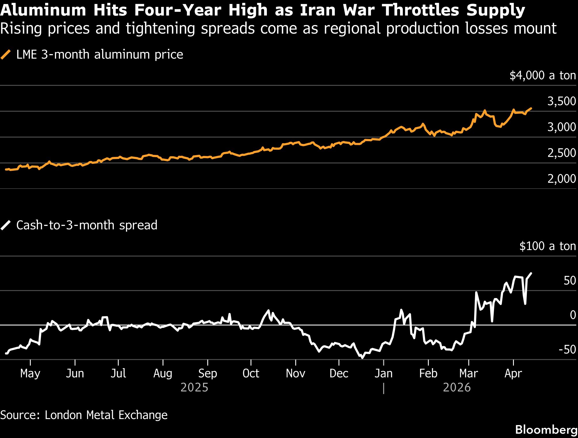Aluminum Hits Four-Year High as Iran War Throttles Supply | Rising prices and tightening spreads come as regional production losses mount
