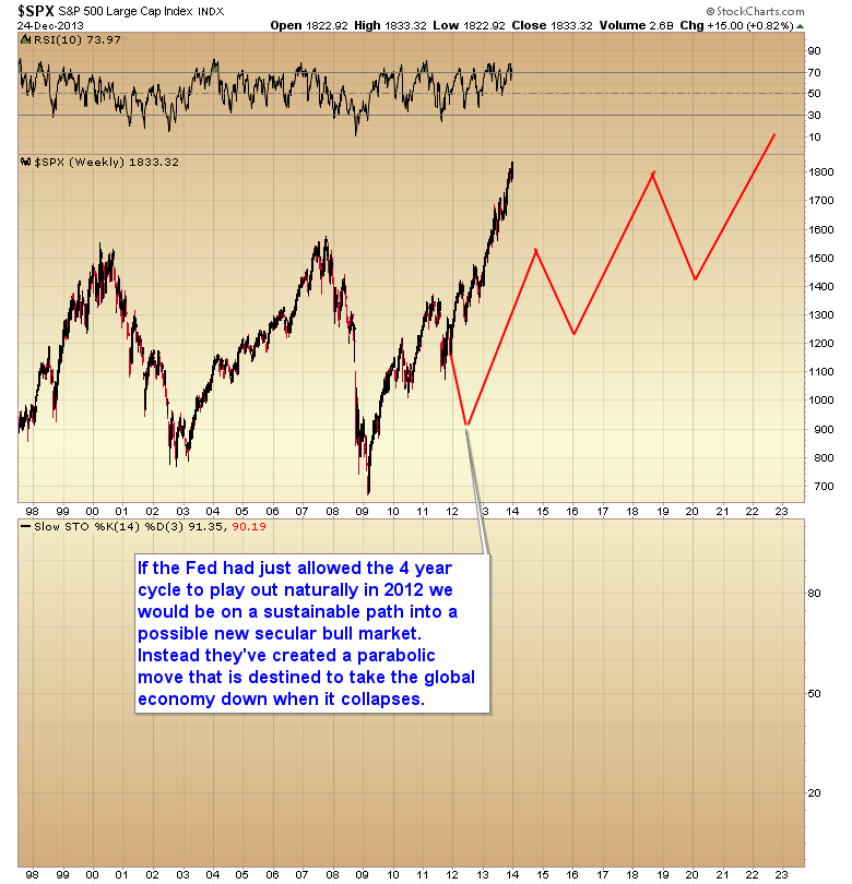 The path creating this unsustainable market behavior began in 2011. If the Fed had just allowed the market to correct naturally and drop down into its 4 year cycle low in 2012 we would probably now be on a sustainable path into another secular bull market.