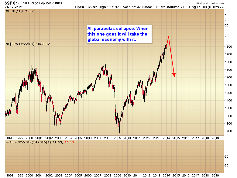 Now here is the problem – parabolas always collapse. There are never any exceptions. When the pin finds this bubble it’s going to take down not only our stock market, but unleash a destructive force on the global economy.