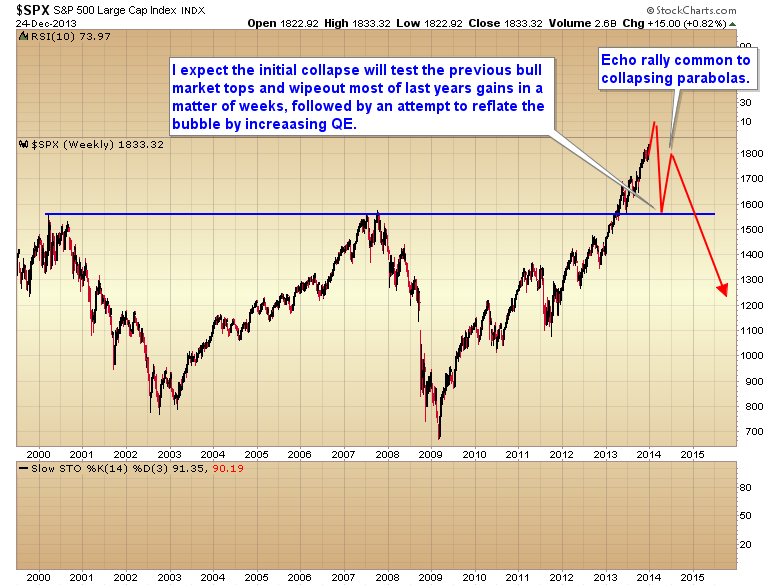 I expect we are going to see the market fall precipitously to test the previous bull market tops and erase most of last year’s gains in a matter of days or weeks. At that point Yellen will panic and all thoughts of tapering will vanish. As a matter of fact I expect the Fed will increase QE, maybe drastically, to try and reflate the parabola.